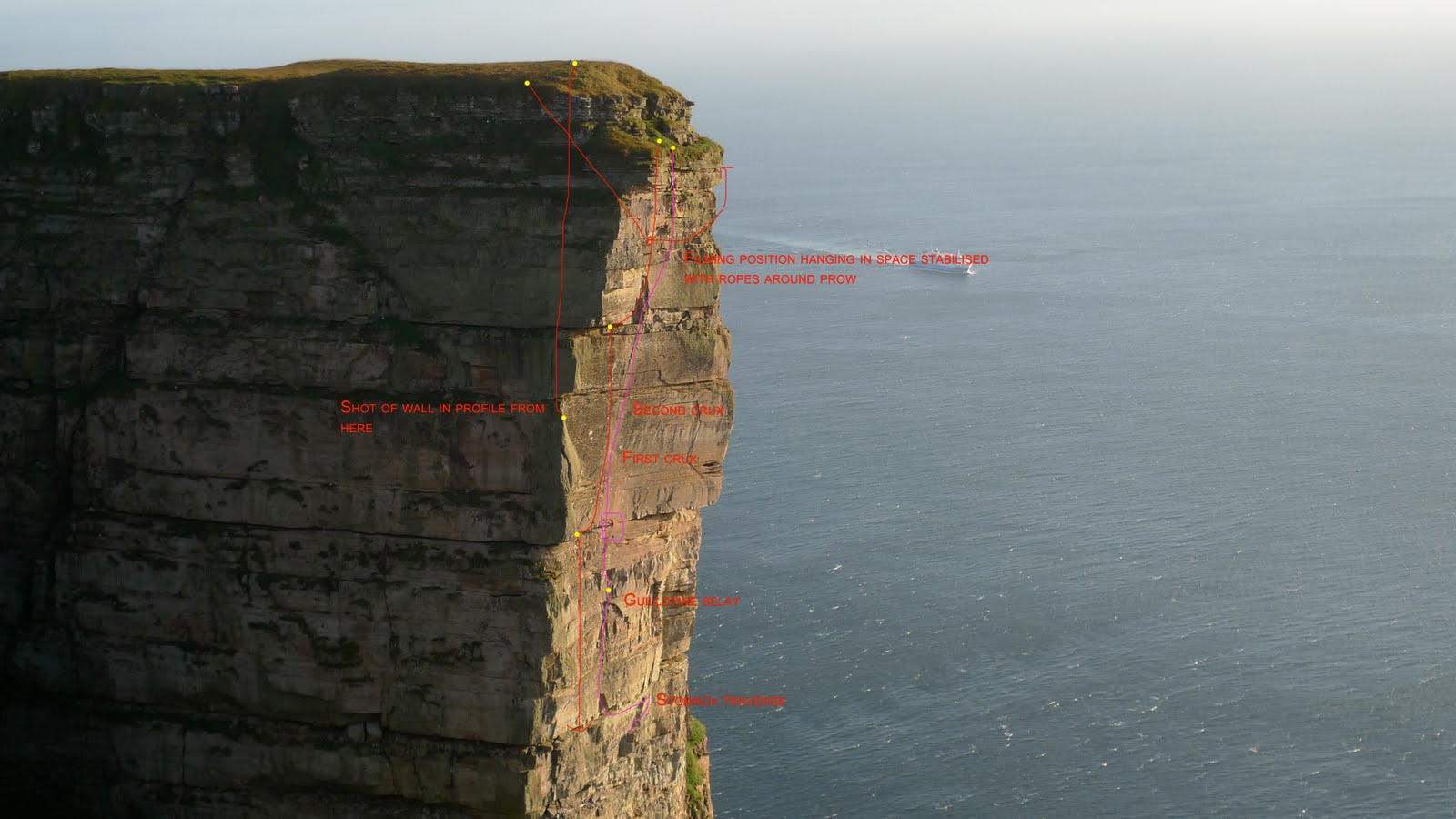 Once we had made it to the coast, Diff and I shot some footage of Dave and Andy arriving at the crag, as well as capturing the moment where Andy saw the route for the first time. The crag is the biggest continuous sea cliff in Britain, and is an incredibly imposing piece of rock. From the promontory where I will be shooting some of my wide shots the line looks extremely impressive.